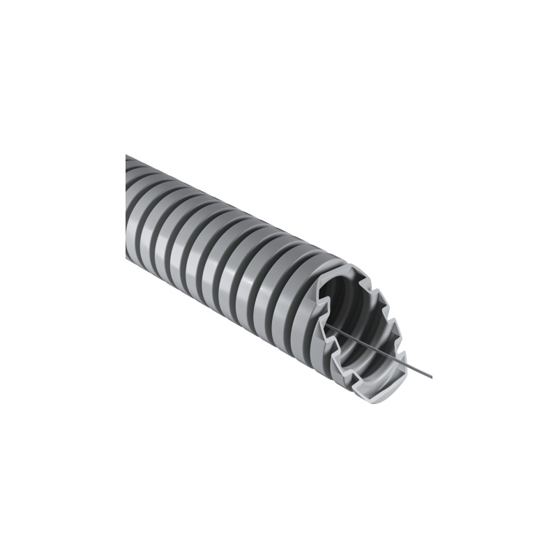 Flexible electrical installation pipe made of polyvinyl chloride (PVC), in light grey color. The pipe has low mechanical resistance and very high flexibility without changing cross-sectional parameters. Usage range: these pipes are ideal for simple electrical cable installation under plaster, also for cable installation in hollow walls, partitions, suspended ceilings and plaster. Used as an insulating and mounting pipe both on the open surface and under plaster. Not suitable for installation in concrete.