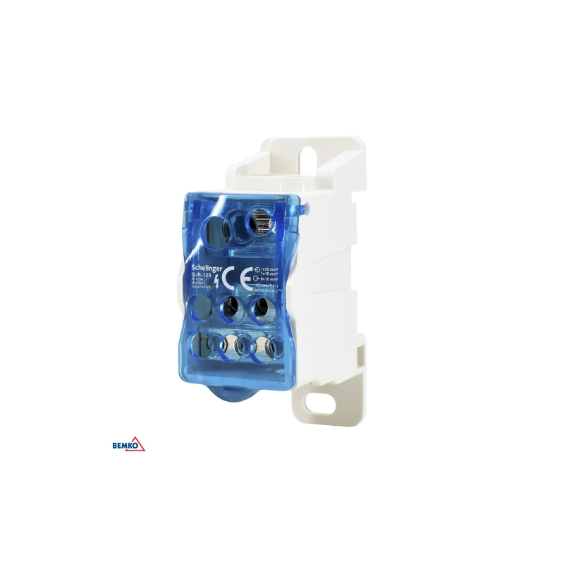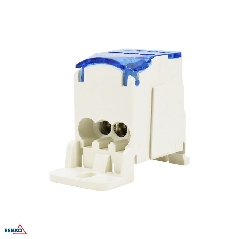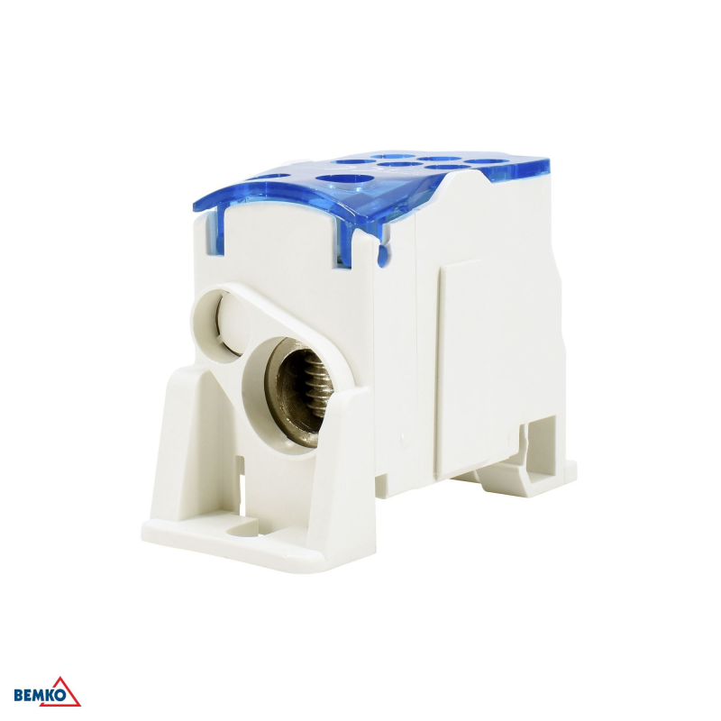 Mėlynas skaidrus dangtelis, srieginiai gnybtai, alavuotas žalvarinis blokas.